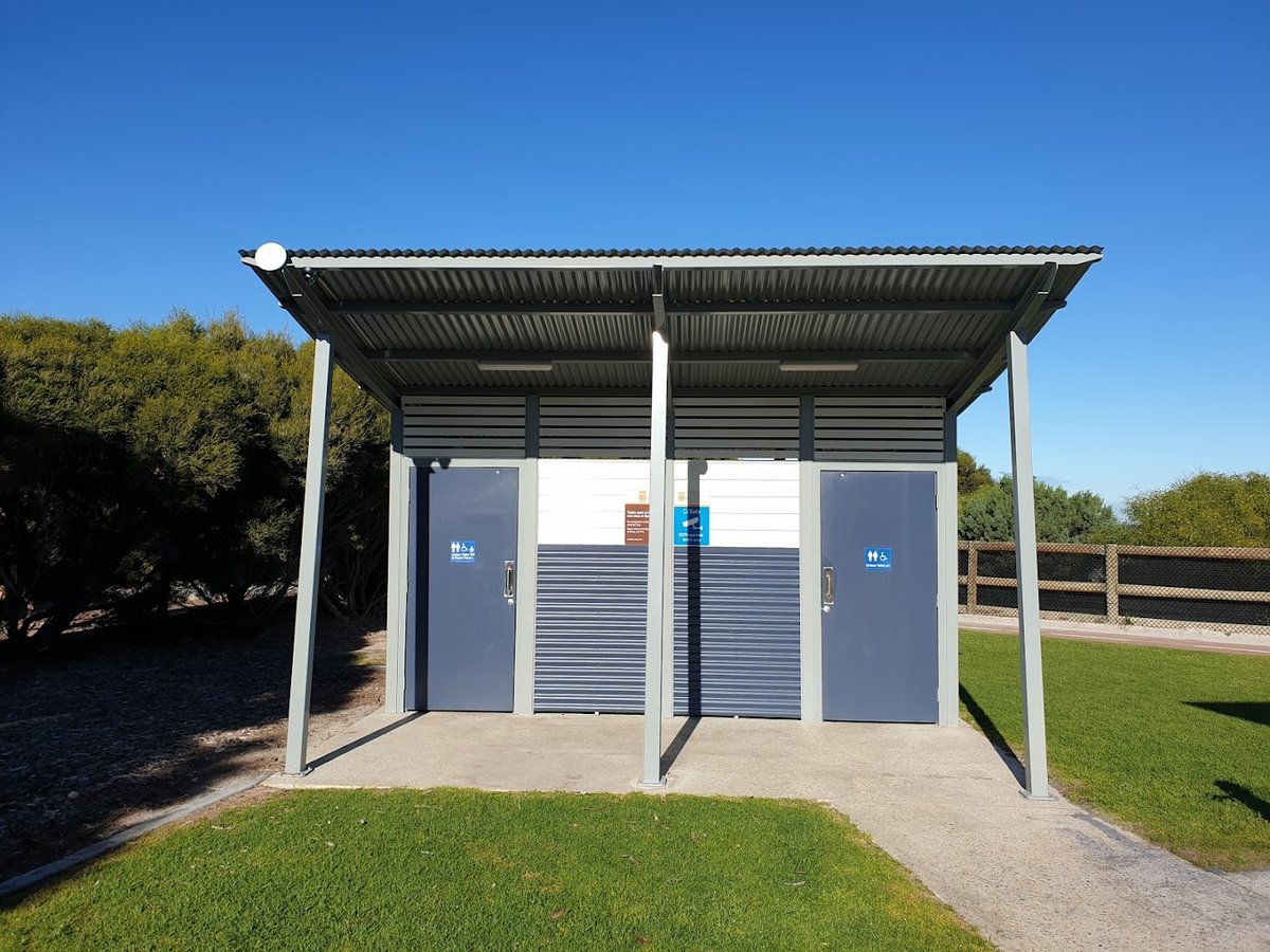 North Coogee Dog Beach is an expansive, scenic coastal destination located in Western Australia, offering a vibrant off-leash environment for dogs and their owners. The park is characterized by its wide, sandy shoreline and clear turquoise waters, providing ample space for dogs to run, play, and swim. The primary ground surface is soft sand, though well-maintained grassy areas are located near the entrance and facilities. While the beach itself is not fenced, it is a designated off-leash zone where dogs can roam freely under supervision. Facilities include a modern public toilet block and 'The Salty Dog Beach Cafe,' which serves refreshments for both humans and their pets. Shade is minimal on the open beach, primarily found under small man-made structures like the toilet pavilion or cafe area. The atmosphere is relaxed and community-oriented, often bustling with activity during peak hours and offering stunning sunset views. Natural features like rocky breakwaters and coastal vegetation add to the park's rugged beauty, making it a popular spot for exercise and socialization in a picturesque maritime setting.