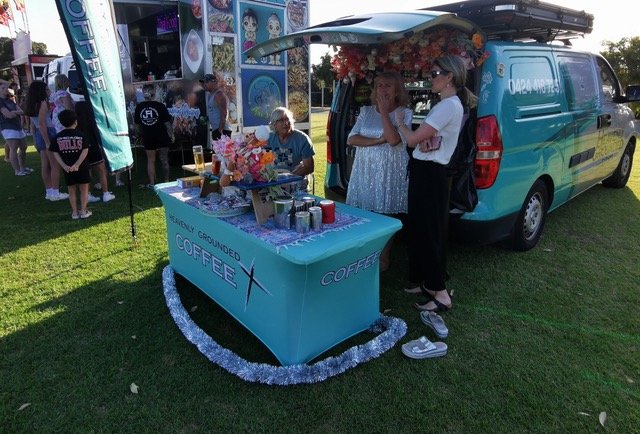 Quinns Dog Beach in Western Australia is a popular coastal destination featuring a combination of expansive sandy shoreline and a dedicated fenced grassy park. The beach area provides a massive off-leash space where dogs can run on the white sand and swim in the clear turquoise waters of the Indian Ocean. For those seeking a more contained environment, there is an adjacent grassy area fully enclosed by chain-link fencing. This fenced section includes a paved walking path, several young trees, and a large blue shade sail for sun protection. Access to the beach is facilitated by a sturdy metal staircase over the dunes. While permanent amenities like toilets aren't pictured, the area occasionally hosts mobile coffee and food vendors on the nearby lawns. The overall atmosphere is scenic and tranquil, offering breathtaking sunset views and a variety of terrains for dogs to explore, from soft dunes to manicured grass.