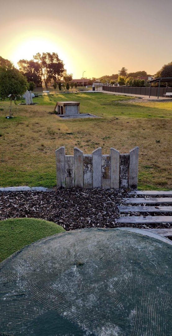 Rockingham Enclosed Dog Park is a spacious and well-equipped facility designed for canine exercise and enrichment. The park features a large, fully fenced area with chain-link fencing, ensuring a safe off-leash environment. The ground surface is predominantly well-maintained grass, complemented by dedicated sand pits for digging and mulched sections around trees. One of the standout features is the extensive range of agility equipment, including colorful mounds, concrete climbing cylinders, an A-frame, and weave poles. For the comfort of both dogs and owners, the park provides several benches, a water drinking station, and ample shade from mature trees scattered throughout the area. There is also a sheltered structure that likely houses picnic tables. The overall atmosphere is one of a modern, active community space. While one image shows a nearby beach, the enclosed park itself offers a diverse range of textures and obstacles to keep dogs engaged.