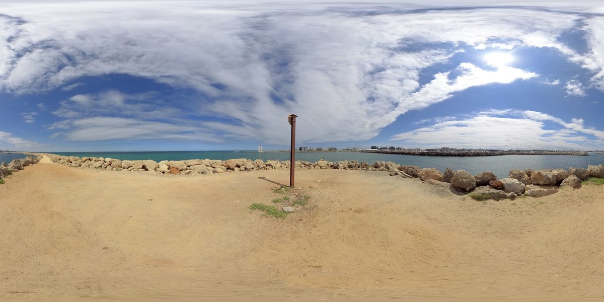 The Fremantle Groyne dog park is a versatile coastal recreation area located in Western Australia, offering a variety of environments for dogs and their owners. The site features a long, sandy groyne path that extends into the ocean, providing a scenic route for leashed or off-leash walks with water on both sides. Adjacent to the groyne is a wide sandy beach where dogs can run freely and swim in the clear, calm waters of the Indian Ocean. Further inland, the park includes a large, well-maintained grassy field bordered by mature trees, offering ample space for fetch and high-energy play. While the area is not fully enclosed by fencing, it is a designated off-leash zone. Facilities include a small shaded garden area with a unique wooden bench and rock table, and a public building that likely houses toilets. The ground surfaces are a mix of sand, dirt, and grass. The overall atmosphere is relaxed and open, making it a popular spot for local pet owners to enjoy the sea breeze and expansive views of the nearby marina.