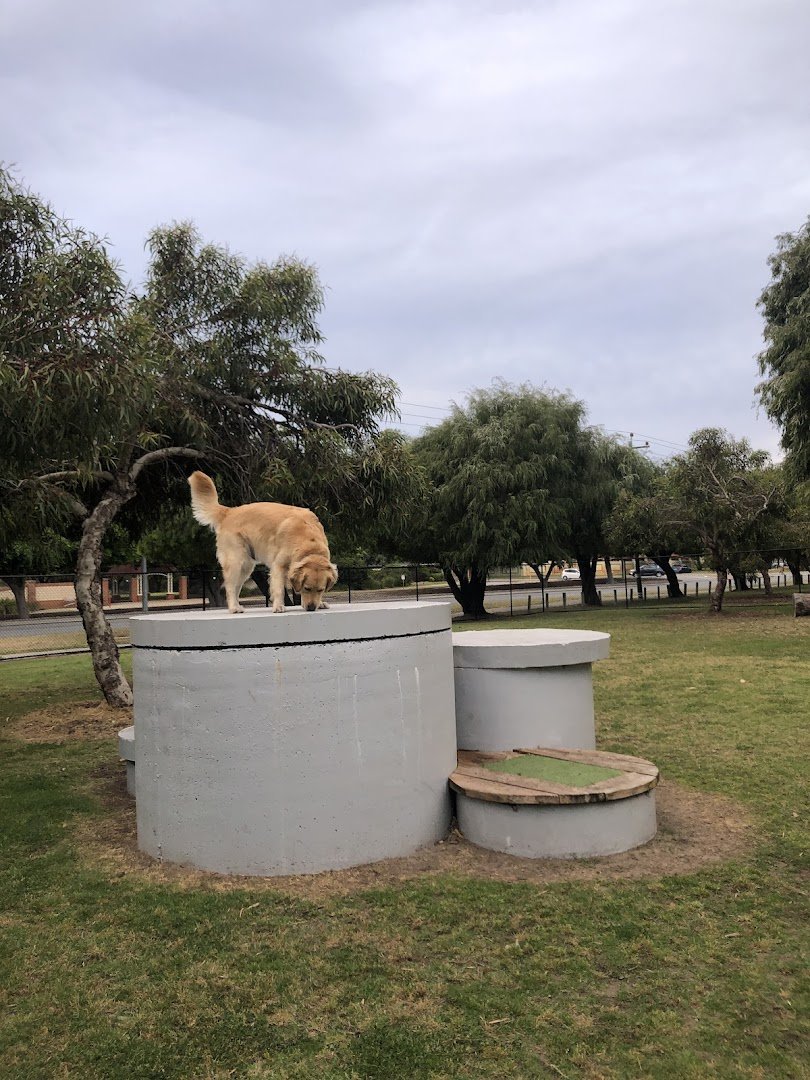 Seahaven Reserve Enclosed Dog Exercise Area is a spacious, fully fenced off-leash park located in a coastal suburb. The park features a large, well-maintained grassy surface, providing ample room for dogs to run and play. It is equipped with various agility elements, including concrete cylinders of different heights and a wooden ramp platform, encouraging active engagement and training. For the comfort of owners, there are benches and a sheltered seating area. The park includes essential amenities such as a dedicated dog water fountain and trash cans for waste disposal. Mature trees around the perimeter offer some natural shade, complemented by man-made structures. The atmosphere is open and inviting, with clear views of the surrounding residential area and proximity to the beach. The secure chain-link fencing ensures a safe environment for dogs of all sizes to exercise freely. The park also features lighting for evening use and is a popular spot for local pet owners to socialize their dogs in a secure, dedicated space.