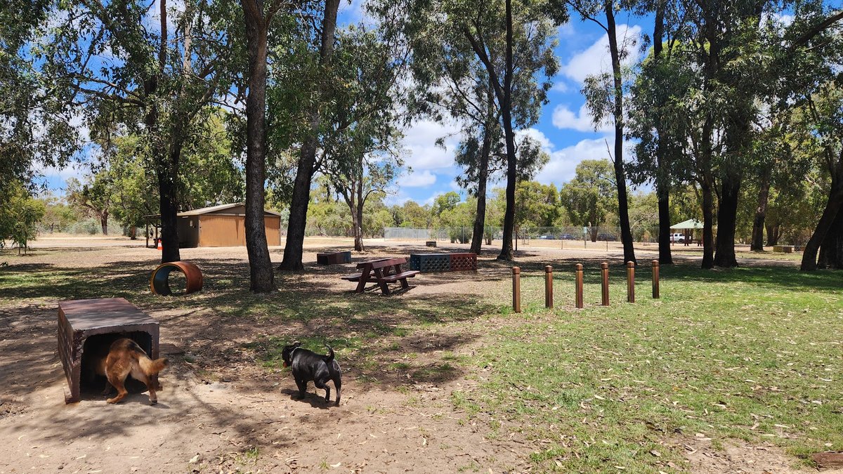 Whiteman Park Dog Park provides a spacious and engaging environment for canine exercise and socialization. The facility features large, securely fenced off-leash areas with a variety of ground surfaces, including well-maintained grass, sandy patches, and natural dirt sections. A standout feature is the extensive array of agility equipment, such as tunnels, ramps, and jumping hoops, scattered throughout the park. For owners, the park offers ample natural shade from mature trees, as well as man-made picnic shelters equipped with benches and tables. The park's layout includes paved concrete paths for easy accessibility. Beyond the immediate dog exercise areas, the surrounding Whiteman Park environment includes a large themed playground with a lighthouse slide, heritage tram lines, and scenic natural wetlands. The overall atmosphere is vibrant and community-oriented, catering to dogs of all sizes and energy levels. Safety is prioritized with double-gated entry points and clear signage outlining park rules. It is a comprehensive recreational destination for both pets and their families.