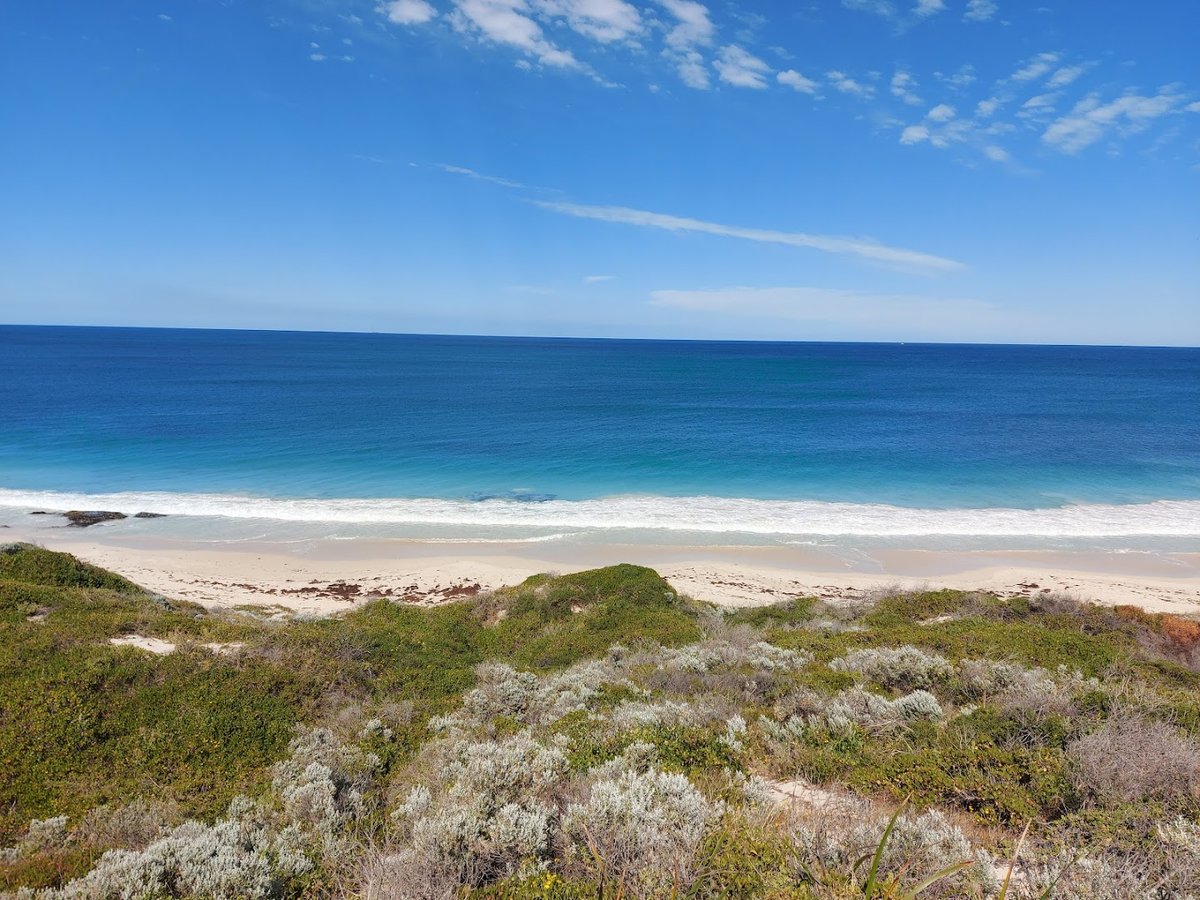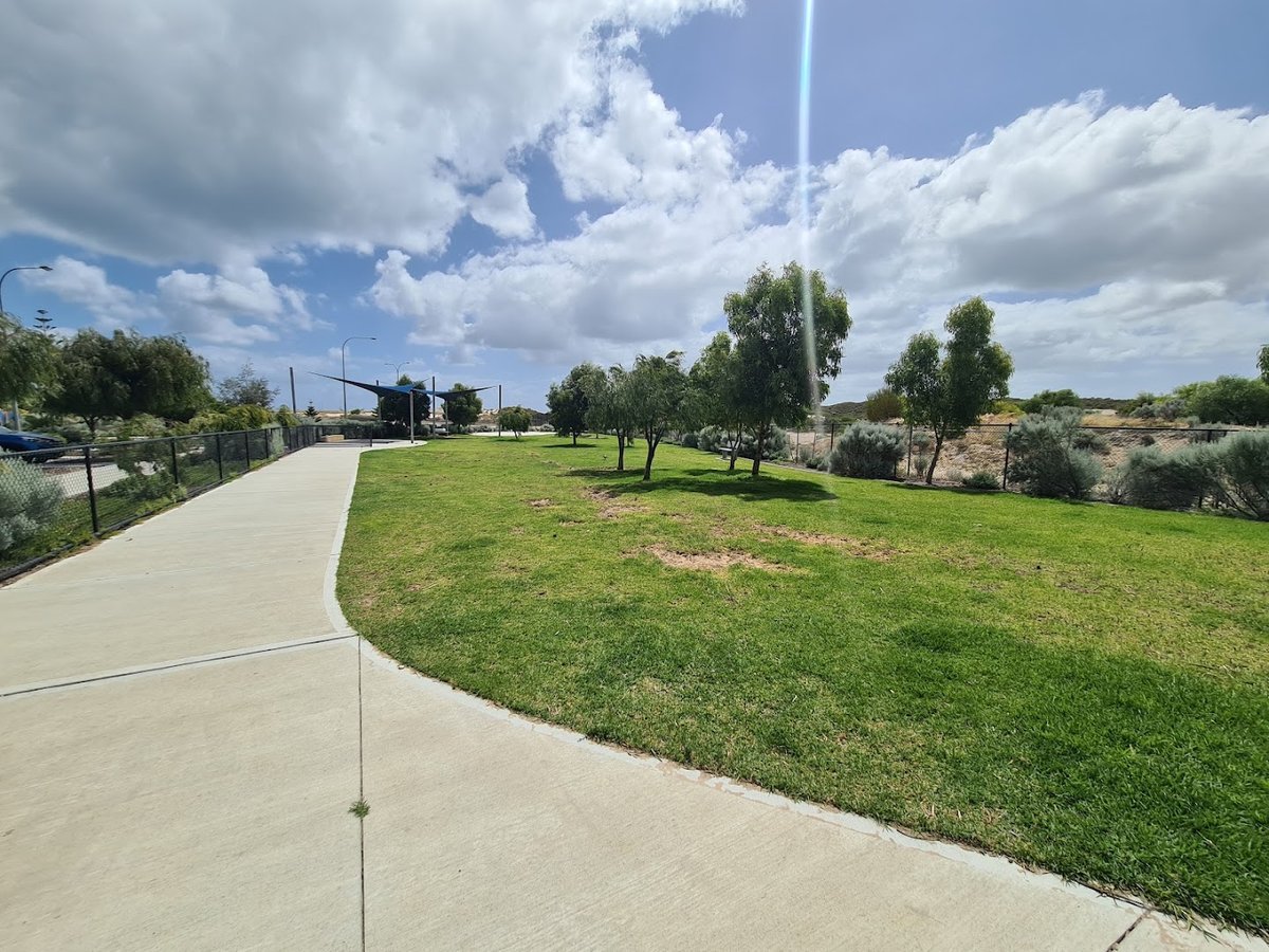Yanchep Dog Beach in Australia provides a versatile environment for pet owners, featuring both a sprawling sandy coastline and a dedicated fenced parkland. The primary attraction is the expansive off-leash beach where dogs can run across the wide sandy shores and play in the surf. This natural area is bordered by coastal dunes and offers a sense of freedom and large open space. Complementing the beach is a smaller, securely fenced exercise area located nearby. This park section features a well-maintained grass surface, a winding concrete path, and young trees. A prominent blue shade sail provides a sheltered spot for visitors. Access to the beach is facilitated by gated entrances along a scenic coastal road, which includes dedicated parking bays and a paved bike path. The overall atmosphere is bright and airy, typical of Western Australia's coastline. While the beach offers a rugged, natural experience, the fenced grassy area provides a more controlled environment for socialization. Facilities like benches and street lighting enhance the convenience for local residents and visitors alike.
